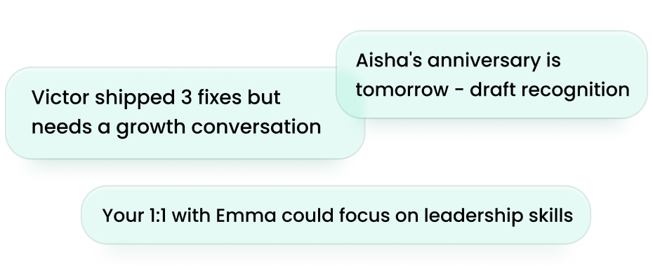 Agents turn meetings and work signals into better actions across managers, employees, and HR. Never walk into a 1:1 unprepared. Never miss a win.